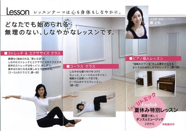 ストレッチ&エクササイズクラス、コーラスクラス、ピアノクラス、どれも紫とも流でいきます!宝塚で学んだこと、その後勉強したことを私自身も一緒に楽しみながら、丁寧に皆様にお伝えします。